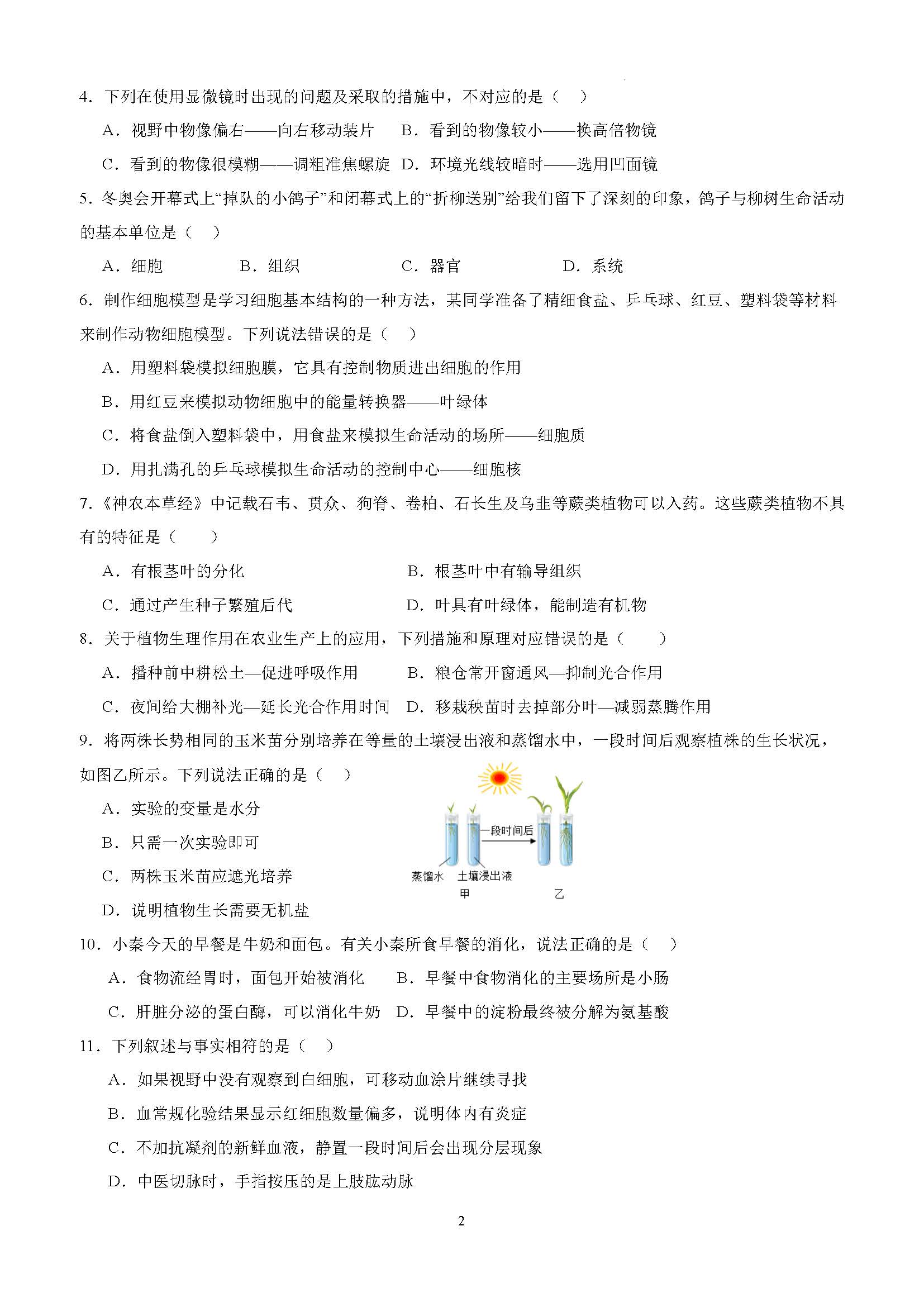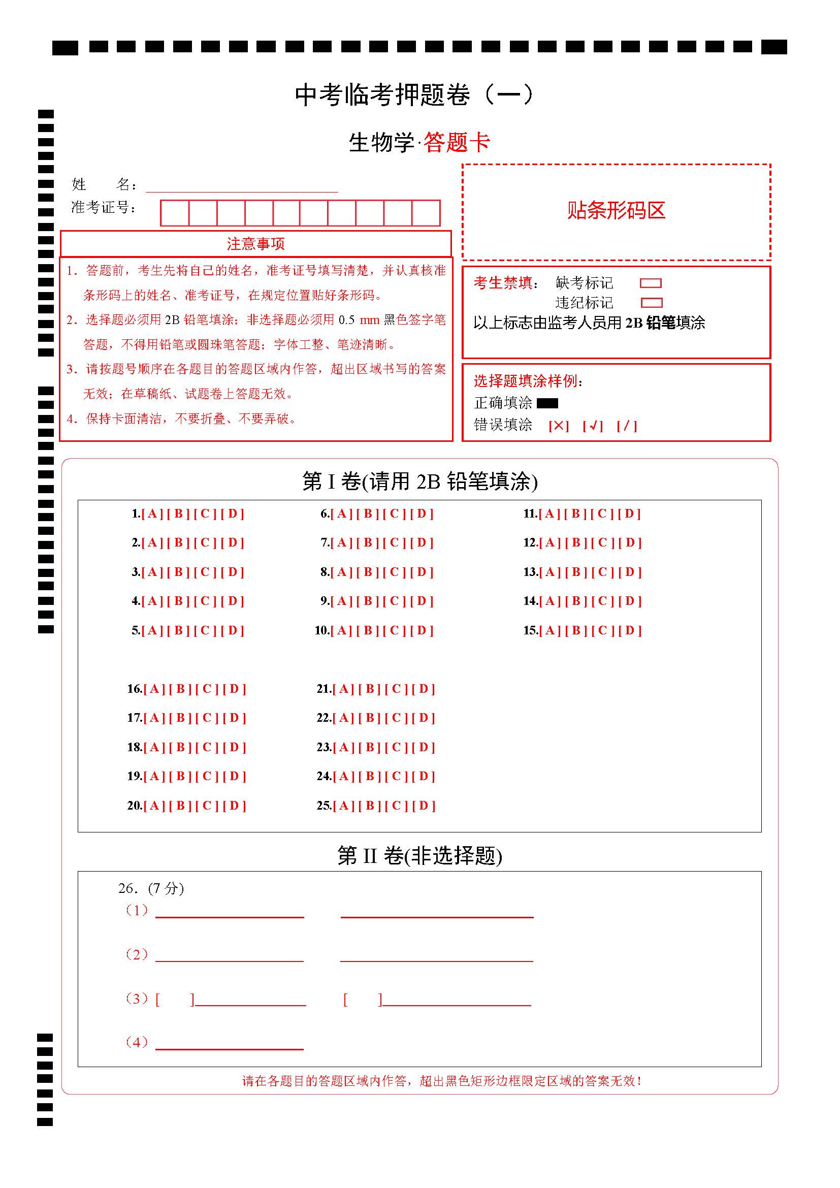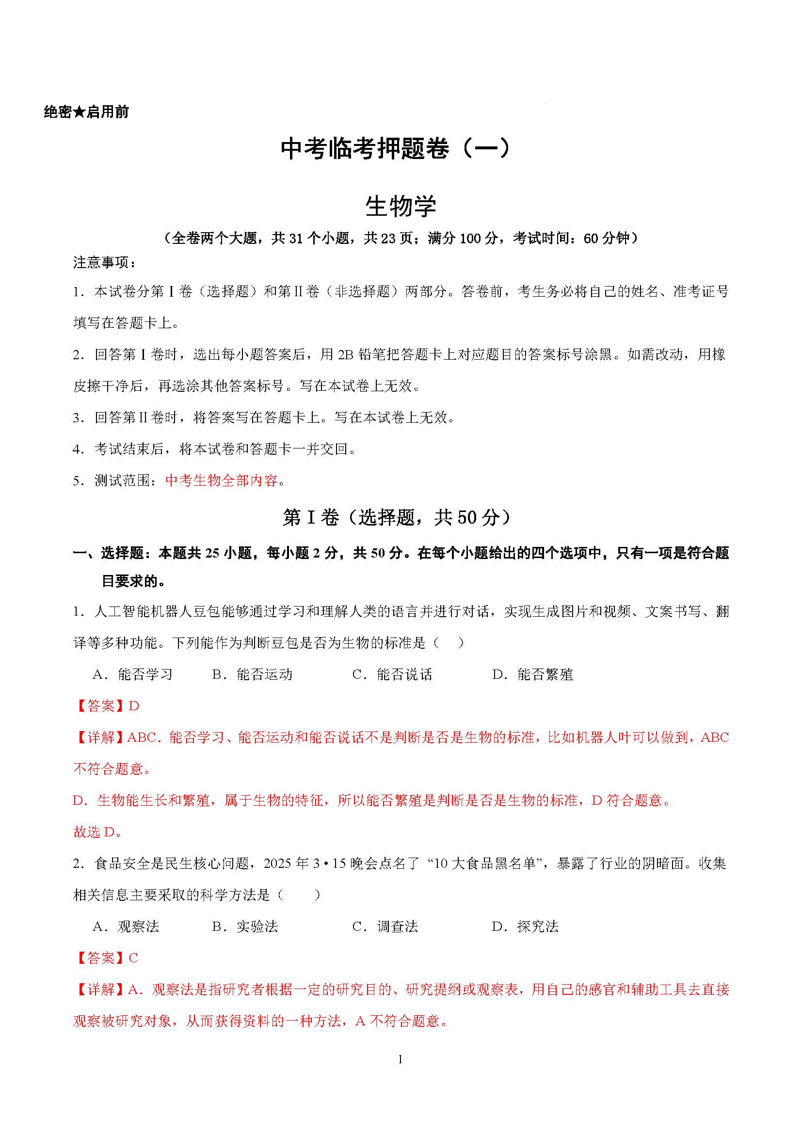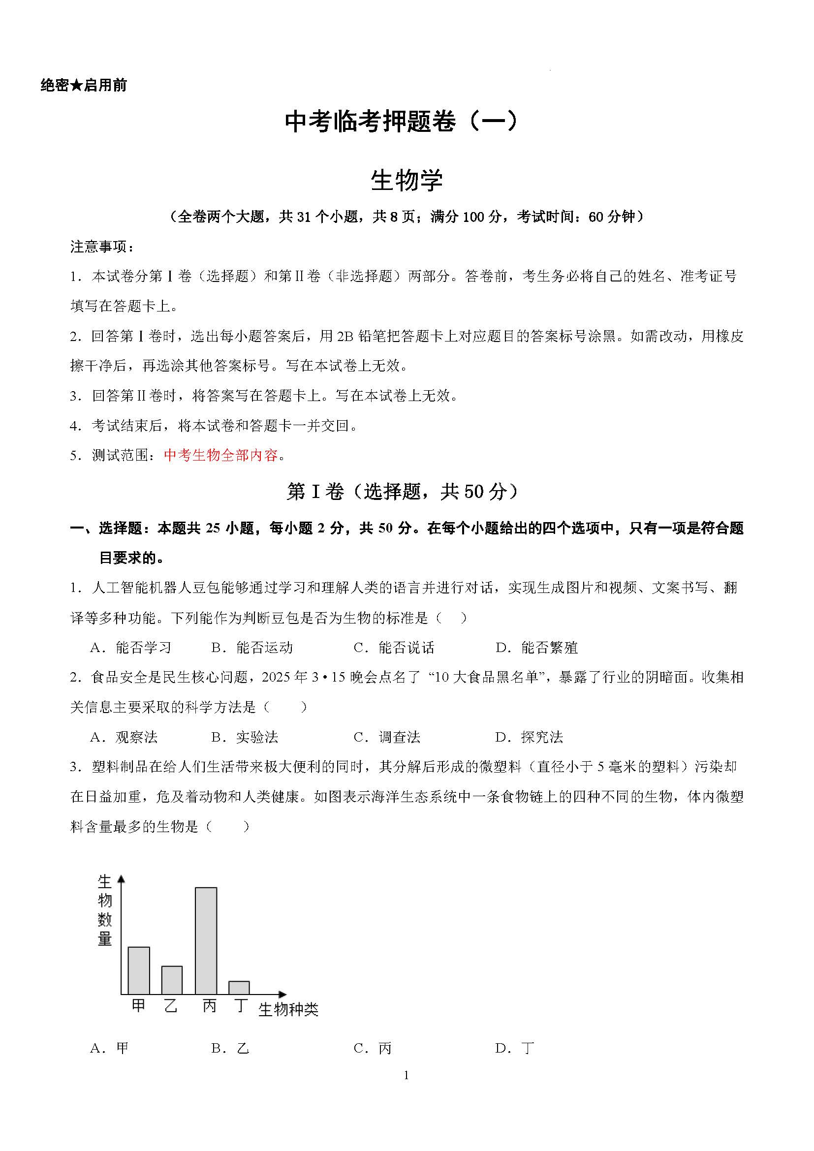 中考生物临考押题卷(一)